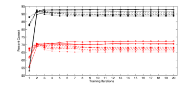 In order to demonstrate these effects, we set up a hidden Markov model (HMM) syllable recognition system based on HTK (the HMM toolkit), a standard tool for speech recognition research. The syllable recogniser was set up to use either MFCCs, or features generated from a cochlear filterbank. The training data were human syllables from a single talker, and the test data were the same human syllables scaled using STRAIGHT to a range of VTL and GPR combinations. In what follows, the word ‘speaker’ refers to utterances resynthesised from the single talker but with theoretical vocal-tract length chosen from a range of values. Features that are more robust to changes in the source size will give better performance when trained on data from a speaker of one size, and then tested on a range of speakers of different sizes.