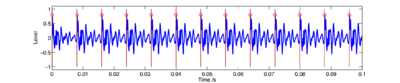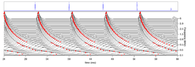 The next stage of the model is the identification of significant or `strobe' points in the NAP. Perceptual research on pitch and timbre indicates that at least some of the fine-grain time-interval information in the NAP survives to later stages of the auditory pathway (Krumbholz et al., 2003; Patterson, 1994a; Patterson, 1994b; Yost et al., 1998). This means that the temporal integration that occurs in the auditory system cannot be simulated by a running temporal average process, since averaging over time destroys the temporal fine structure within the averaging window (Patterson et al., 1995). Patterson et al. (1992) argued that it is the fine-structure of periodic sounds that is preserved rather than the fine-structure of noises, and they showed that this information could be preserved by finding peaks in the neural activity as it flows from the cochlea, measuring time intervals from these strobe points to smaller peaks, and forming a histogram of the time-intervals, one for each channel of the filterbank. This two-stage temporal integration process is referred to as strobed temporal integration (STI). The strobe-point-finding (or 'strobing') process identifies certain peaks in the NAP and the timings of these strobe points are used to initiate a temporal integration process in the following stage. The strobe pulses enable the segregation of the pulse and resonance information and they control pulse-rate normalisation. For ideal pulse-rate normalisation, the chosen NAP peaks should correspond to the onset of a pulse in the input sound. However, auditory image construction is robust, in the sense that strobing does not have to occur exactly once per cycle to be effective.