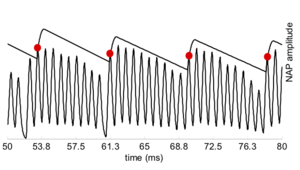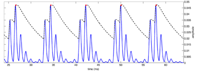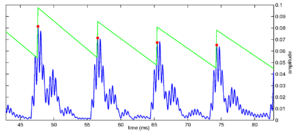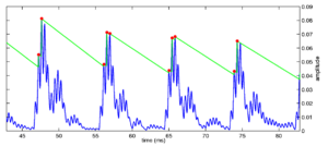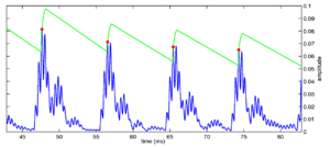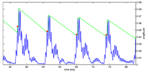 Strobe detection in AIM is performed using a dynamic thresholding technique. Figure 11 shows the 'parabola' dynamic thresholding algorithm applied to a NAP. A threshold which decays linearly over time is placed on the signal; when the signal exceeds the threshold a strobe point is issued, and the threshold rises briefly above the level of the signal at that point. The threshold then decays again until it meets the signal and the process repeats. This has the effect of causing strobes to be issued only on certain peaks in the NAP.