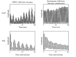 The basilar membrane motion is converted into a simulation of the neural activity pattern (NAP) observed in the auditory nerve using a model of the neural transduction that occurs in the hair cells of the cochlea. The most important feature of this stage is that the signal is half-wave rectified, mimicking the unipolar response of the hair cell, while keeping it phase-locked to the peaks in the wave. Experiments on pitch perception indicate that the fine structure retained by phase-locking is required to predict the pitch shift of the residue (Yost et al., 1998). Other rectification algorithms like squaring, full-wave rectification and the Hilbert transform only preserve the envelope. At this stage, it is also possible to apply compression to the waveform. The compression is intended to simulate the cochlear compression which is essential to cope with the large dynamic range of natural sounds.This compression is already present in the dcGC and PZFC filters, but is absent in the gammatone filters. Figure 10 shows the results of NAP processing on the four vowels.