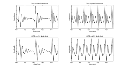 In the next few sections, the workings of AIM will be discussed. In order to illustrate each stage, four STRAIGHT-scaled vowel sounds will be processed using the model, and plotted side-by-side for comparison. The four vowels are shown in Figure 8; each is an /a/ vowel. Each subfigure of Figure 8 shows the waveform from a different speaker uttering the vowel sound. In the lower subfigures, the waveforms have a resonance rate of 89% of that of the original speaker. This corresponds to a person with a VTL of approximately 17.5cm or of height of 194cm. In the upper subfigures are the waveforms for a resonance rate of 122% (VTL 12.7cm; height 142cm). The left subfigures are for a GPR of 110 Hz and the right subfigures for a GPR of 256 Hz.