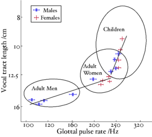 In a related study, Smith and Patterson (2005), again using scaled vowels, demonstrated that VTL has a strong effect on the perception of speaker size. In this experiment, listeners were asked to judge the height of a speaker with a given combination of GPR and VTL on a seven-point scale from 'very tall' to 'very short'. Listeners were also asked to judge the sex and the age of the presented speakers from four choices: 'man', 'woman', 'boy' and 'girl'. Size judgements were strongly affected by VTL and only slightly affected by GPR. Sex and age judgements for vowels with GPR and VTL values in the range of normally-encountered speakers were influenced about equally by both variables, but for vowels with low GPR and short VTL, VTL played a greater role in the decision.