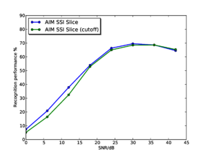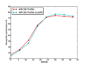 AIM-C includes modules for the gammatone, dcGC and PZFC filterbanks and for various strobed temporal integration algorithms. The filterbank implementations in AIM-C run considerably faster than the equivalent versions in AIM-MAT. In general, there is at least an order of magnitude improvement in speed available in using AIM-C over AIM-MAT. This speed increase is crucial when processing large datasets. It is AIM-C that made it possible to perform the syllable recognition studies presented in chapters 2 and 4.