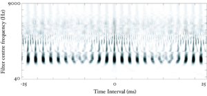 The STI process can be thought of as a modified form of autocorrelation. In autocorrelation, a signal is cross-correlated with itself to yield a measure of how well-correlated the signal is with itself when delayed by a range of different `lags'. Zero-lag is at the centre of the output, and the function is symmetrical about this point. In STI, the signal is instead cross-correlated with a function that is zero everywhere except at the strobe points. The height of the signal at these strobe points determines the weight with which that time interval is represented in the output. The process is less computationally intensive than autocorrelation, as one of the signals is sparse, being composed mostly of zeros. Unlike autocorrelation, the resulting output is no longer symmetrical about the zero-lag point (Irino and Patterson, 1997), and any temporal asymmetry in the input signal is preserved. This is an important feature of the SAI, as temporal asymmetry is a key feature of pulse-resonance sounds (Patterson and Irino, 1998). Figure 14 shows correlograms for the four vowel sounds. The zero-lag line is at the left of the image. Each of the structures due to the pulse repetition rate is more symmetrical in the correlogram than in the stabilised auditory image.