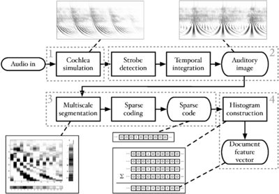 In chapter 6, a complete sound analysis system is constructed and analysed. The system uses AIM in one of its variants to generate features from audio to pass to a machine learning system. The technology has not previously existed to run AIM-like models on large databases of sounds. In AIM-C and the machine hearing systems developed at Google, we now have the technology to investigate the application of AIM to large-scale problems. This is an important and notable step forward in the field. Previously the use of AIM had been limited to the analysis of small datasets. The system described is able to process days of audio data in a matter of a few hours by the combination of efficient code and large computing resources.