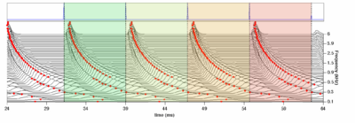 The 'ti2003' algorithm is the default method for generating SAIs in the software packages AIM-MAT and AIM-C (which are discussed below). It works in the following way. When a strobe occurs it initiates a temporal integration process during which NAP values are added into the corresponding channel of the SAI as they are generated; the time interval between the strobe and a given NAP value determines the position where the NAP value is entered in the SAI. In the absence of any succeeding strobes, the process continues for 35ms and then terminates. If more strobes appear within 35 ms, as they usually do in music and speech, then each strobe initiates a new temporal integration process. Each process is given a weight with which NAP values from that process are added to the SAI. Initially these weights are inversely proportional to the index of the strobe in the series so, for example, if there are three active strobes, the oldest strobe is added with weight 1/3 relative to the most recent strobe which is added with weight 1. Finally, the weight set is normalised to sum to unity so that the overall level of the auditory image is normalised to that of the NAP.