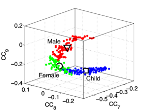 The problem that MFCC feature vectors pose for the recogniser is illustrated in Figure 16 (redrawn from an original figure by Christian Feldbauer, and published in Patterson, Walters, Monaghan, Feldbauer and Irino (2010)). It shows the feature space formed by the 7th, 8th, and 9th cepstral coefficients for the vowel /i/ as VTL varies over the range of human lengths. Whereas the mel-frequency spectrum shifts in an approximately linear way as VTL increases with height, the magnitudes of the individual components change in a nonlinear way. The square, circle and triangle show average values for children, women and men respectively. A recogniser trained on the /i/ vowels of a group of adult males (in the region of the triangle) is unlikely to recognise the /i/ of a woman (in the region of the circle) or the /i/ of a child (in the region of the square) as being within the cluster it learned for /i/.