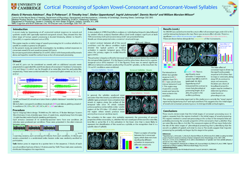 The present study uses fMRI to investigate the processing of consonant-vowel (CV) and vowel-consonant (VC) syllables to determine the locus of consonant-processing in the human brain. We used 3 classes of consonant (fricatives, sonorants and stops) combined with 5 canonical English vowels (/a/, /e/, /i/, /o/, /u/), to create CVs and VCs. Vowels, a spectrally matched nonspeech condition, and silent intervals were included as controls. Stimuli were 6.8s strings of 10 pseudo-randomly assorted tokens from one condition. We used a sparse imaging design. Stimuli were presented during a 6.9s silent inter-scan interval (TA: 2.1s, TR: 9s). 14 normally-hearing, right-handed, native English speakers heard 8 stimuli from each condition in a randomised order, in 3 blocks of 72 scans.