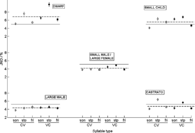 The results for each of the five reference speakers are shown in Fig. 2 as a set of psychometric functions, where the layout mirrors that for the reference conditions presented in Fig. 1. That is, the positions of psychometric functions reflect the position of the reference condition on the GPR-VTL plane; the small child is at the top right and the large man is at the bottom left. The data have been averaged across listeners because there was very little difference between listeners. They have also been averaged over syllable type, because the data for individual syllable types showed very similar patterns and levels of performance. The abscissa for the psychometric functions is VTL expressed as a percentage of the reference VTL; the ordinate is the percentage of trials on which the test interval was identified as having the smaller speaker. The error bars show ± 2 standard deviations over all listeners and syllable types. A cumulative Gaussian function has been fitted to the data for each psychometric function and used to calculate the JND. The JND was defined as the difference in VTL for a 26% increase in performance from 50 to 76% performance; it is shown on each graph at the top left corner, and the error shows 2 standard deviations of the fitted Gaussian function. Figure 2 shows that size discrimination is possible for each of the five speaker types; performance is best for the small-male/large-female speaker type and poorest for the dwarf speaker type. The JND values for the individual syllable groups are summarized in Table II. A summary of the JND values is shown in Fig. 3, which has the same layout as Figs 1 and 2. The JNDs for the six syllable groups are shown separately for each speaker type. The JND for both the large male speaker type and the small-male/large-female speaker type is stable at around 4 % for all syllable types. The JND for the castrato speaker type is slightly worse, particularly for syllables containing stop consonants for which the JND is 5-6 %. The JNDs for the dwarf speaker type and the small child speaker type are around 7 % and 6 % respectively, and again it is worst for syllables with stop consonants.