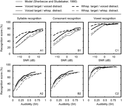 Five types of scores were considered: syllable recognition (the primary task); consonant or vowel recognition (only one has to be correct); consonant-vowel order, and manner (i.e. consonant category). The average syllable, consonant and vowel recognition scores for the four vocal conditions are shown as a function of SNR in the top panels of Figure 1. They show the expected effect of SNR and some notable effects of voicing. To control for the predictable effect of audibility caused by the difference in spectrum between voiced and whispered speech, the following analysis was run: For each trial, an audibility index (the Speech Intelligibility Index (SII), ANSI, 1997) was calculated by deriving the spectrum levels for the target and distracter syllables. The distracter’s spectrum levels were used as masker when estimating the audibility of the targets. An importance function for English nonsense syllables was used according to the ANSI standard. A transfer function (Sherbecoe and Studebaker, 1990) was then fitted to the data. This analysis allows for a data-driven audibility-controlled prediction of recognition performance. The results of this transform are shown in the bottom row of Figure 1. They show the effects of voicing once audibility has been taken into account.