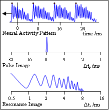 The essence of GPR and VTL normalization is illustrated in Fig. 2; it shows how the information in the vowel sound, /a/, can be segregated and used to construct a ‘pulse image’ and a ‘resonance image’, each with their own time-difference dimension, Δtp and Δtr. The scale is logarithmic in both cases. The upper panel shows the neural activity produced by the /a/ sound of Fig. 1 in the auditory filter centred on the second formant of the vowel (near 1500 Hz). The largest peaks in the wave are from the glottal pulses; they bound the resonances in time and control the pulse normalization process. It is assumed that when the neural representation of glottal pulse, pn, reaches the brainstem, it initiates a pulse process and a resonance process both of which run until the next glottal pulse arrives. The pulse process simply waits for the next pulse, and when it arrives, calculates the time difference, (Δtp=tn+1-tn) and increments the corresponding bin by the height of the pulse. The pulse, pn+1, terminates the pn process and initiates a new pulse process, and so on. The image decays continuously in time with a half life of about 30 ms, so when the period of the wave is 10 ms or more, the peak in the image is essentially stable because it is incremented three or more times in the time it would take to decay to half its height. This is the essence of Pulse-Rate Normalization (PRN). The resonance process is very similar to the pulse process; however, during the time between pulses, it adds a copy of the resonance behind the current pulse, into the resonance image. So the resonance values in the image are each incremented by the value of the resonance at t – tn. The half life of the resonance image is the same as the pulse image. Now consider the pulse and resonance images that would be produced by the waves in Figure 1. The wave in (a) would produce a stable peak at 6 ms in the pulse image and a stabilized version of the resonance in the resonance image. When the glottal period increases to 12 ms as in (b), the peak at 6 ms in the pulse image would decay away over about 100 ms as a new peak rises at 12 ms. The resonance in the region 0 < Δtr < 6 would not change. When the resonance expands as in (d), the peak in the pulse image at Δtp = 8 ms would be unaffected. The resonance function would shift a little to the left (larger Δtr values) without changing shape. This is the essence of Resonance Scale Normalization (RSN). The resonance shape is the message; the distance from the origin represents the length of the vocal tract. These processes can be applied to all of the channels of AFA to produce the complete analysis of the syllable. In summary, these simple normalization processes segregate the GPR information from the VTL information, and segregate the resonance scale information from the resonance shape information (the message).