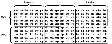 A structured corpus of simple syllables was used to establish both the ASR robustness norms and the HSR robustness norms. The corpus was compiled by Ives et al. (2005) who used phrases of four syllables to investigate VTL discrimination and show that the just-noticeable difference (JND) in speaker size is about 5 %. There were 180 syllables in total, composed of 90 pairs of consonant-vowel (CV) and vowel-consonant (VC) syllables, such as ‘ma’ and ‘am’. There were three consonant-vowel (CV) groups and three vowel-consonant (VC) groups as shown in Table I. Within the CV and VC categories, the three groups were distinguished by consonant category: sonorants, stops, or fricatives. So, the corpus is a balanced set of simple syllables in CV-VC pairs, rather than a representative sample of syllables from the English language. The vowels were pronounced as they are in most five vowel languages, like Japanese and Spanish, so that they could be used with a wide range of listeners. A useful mnemonic for the pronunciation is the names of the notes of the diatonic scale, “do, re, mi, fa, so” with “tofu” for the /u/. For the VC syllables involving sonorant consonants (e.g., oy), the two phonemes were pronounced separately rather than as a diphthong.