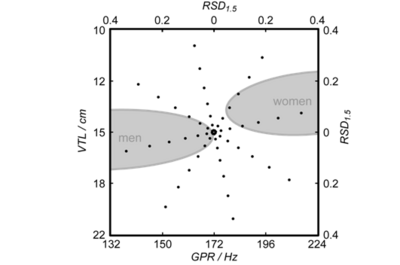 In the HSR study, pilot testing made it clear that performance would be good throughout the GPR-VTL plane, and as a result, the listeners were only trained with the central, reference speaker and then tested with the speakers on ellipse seven with the RSD value, 0.3466. These are the speakers at the ends of the spokes with GPR and VTL values most different from the reference speaker. A comparison of the ASR and HSR results is presented in the final section of the Results and Discussion section below.