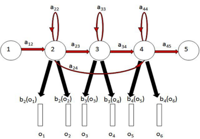 The Hidden-Markov-model Toolkit (HTK) was used to create a three state, hidden Markov model for syllable recognition, using feature vectors composed of 13 MFCCs. HTK models speech as a sequence of stationary segments, or frames, produced by a Markov model (e.g., Figure 5). The Markov model has non-emitting initial and final states and an indefinite number of emitting states between them. The probability of moving between one state, i, and the next state, j, as a function of time, is given by a discrete probability, aij. Only transitions forward in time from left to right are permitted. As the states are passed through in time steps, they emit a series of equally spaced feature vectors characteristic of the sound being produced. These feature vectors are assumed to give an accurate representation of a frame of speech, which is typically of the order of 10ms. The probability of a state, i, emitting a feature vector, ot, is given by a probability density, bi(ot). The initial and final non-emitting states are used to produce the composite model used in continuous speech recognition. They are used to indicate the probability of a given syllable being followed or preceded by another syllable, and so they are not used in isolated syllable recognition.If a syllable is modelled as a sequence of feature vectors, O = o1, o2, ... oT, the recognition problem is solved by finding the i that maximizes P(si|O), where si is the ith syllable. Using Bayes’s theorem this probability is: