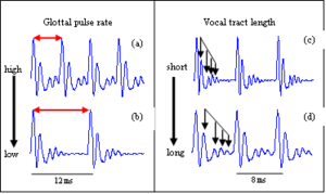 At the heart of each syllable of speech is a vowel; Figure 1 shows four versions of the vowel /a/ as in ‘hard’. From the auditory perspective, a vowel is a ‘pulse-resonance’ sound, that is, a stream of glottal pulses each with a resonance showing how the vocal tract responded to that pulse. Many animal calls are pulse resonance sounds. From the speech perspective, the vowel contains three important components of the information in the larger communication. For the vowels in Fig. 1, the ‘message’ is that the vocal tract is currently in the shape that the brain associates with the phoneme /a/. This message is contained in the shape of the resonance which is the same in every cycle of all four waves. In the left column, one person has spoken two versions of /a/ using high (a) and low (b) GPRs; the pulse rate (PR) determines the pitch of the voice. The resonances are identical since it is the same person speaking the same vowel. In the right-hand column, a small person (c) and a large person (d) have spoken versions of /a/ on the same pitch. The pulse rate and the shape of the resonance are the same, but the rate at which the resonance proceeds within the glottal cycle is slower in the lower panel. This person has the longer vocal tract and so their resonance rings longer. VTL is highly correlated with the height of the speaker (Fitch and Giedd, 1999). In summary, GPR corresponds to the pitch of the voice, the shape of the resonance corresponds to the message, and resonance rate corresponds to VTL and, thus, to speaker size.