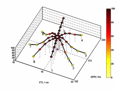 where X and Y are the coordinates of GPR and VTL, respectively, in this log-log-space, and χ is the GPR-VTL trading value, 1.5. The speaker values were positioned along each spoke in logarithmically increasing steps on these logarithmic co-ordinates. The seven RSD values were 0.0071, 0.0283, 0.0637, 0.1132, 0.1768, 0.2546, and 0.3466. There are eight speakers associated with each RSD value, and their coordinates form ellipses in the logGPR-logVTL plane. The seven ellipses are numbered from one to seven, beginning with the innermost ellipse, with an RSD value of 0.0071.