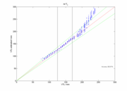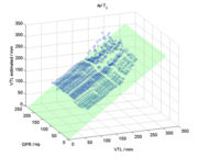 The range of VTL is much greater in T1 and the performance of the VTL estimator is considerably better for T1; when the feature vector has the same make up (i.e., both Gaussian weights and means), performance rises from 88.4% to 94.4%. Figure 13 shows the corresponding projection of VTL performance onto the VTL-VTLest plane when the training set is T1; it shows that the deviation is reduced considerably at the higher VTL values, as would be expected.