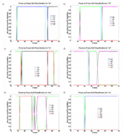 The ability of the soft recognition procedure (described in section 2.2.1) to differentiate between vowels and consonants was tested. The testing procedure consisted of analysing six different syllables (“ar”, “et”, “lo”, “si”, “up”, “va”) spoken by the reference speaker. These were chosen to reflect the variety of syllabic communication sounds: together these syllables include all five vowels with sonorants (“ar”, “lo”), fricatives (“si”, “va”) and stops (“et”, “up”). Initially the identification was attempted with no constraints (see Figure 9). The vertical dashed turquoise lines divide the vowel from the consonants in each syllable; the division points were estimated from the waveforms of the sounds.