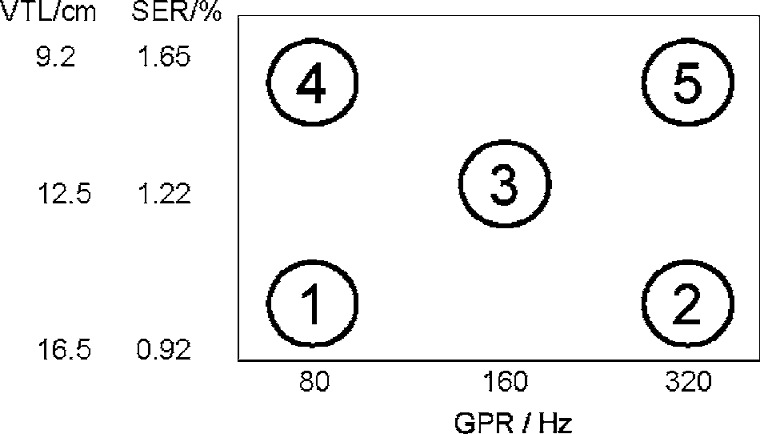 Figure 1. The GPR-VTL combinations for the five reference speakers in the experiment. These speakers are typically heard as a large male (1), a castrato (2), a small male or a large female (3), a dwarf (4), and a small child (5).