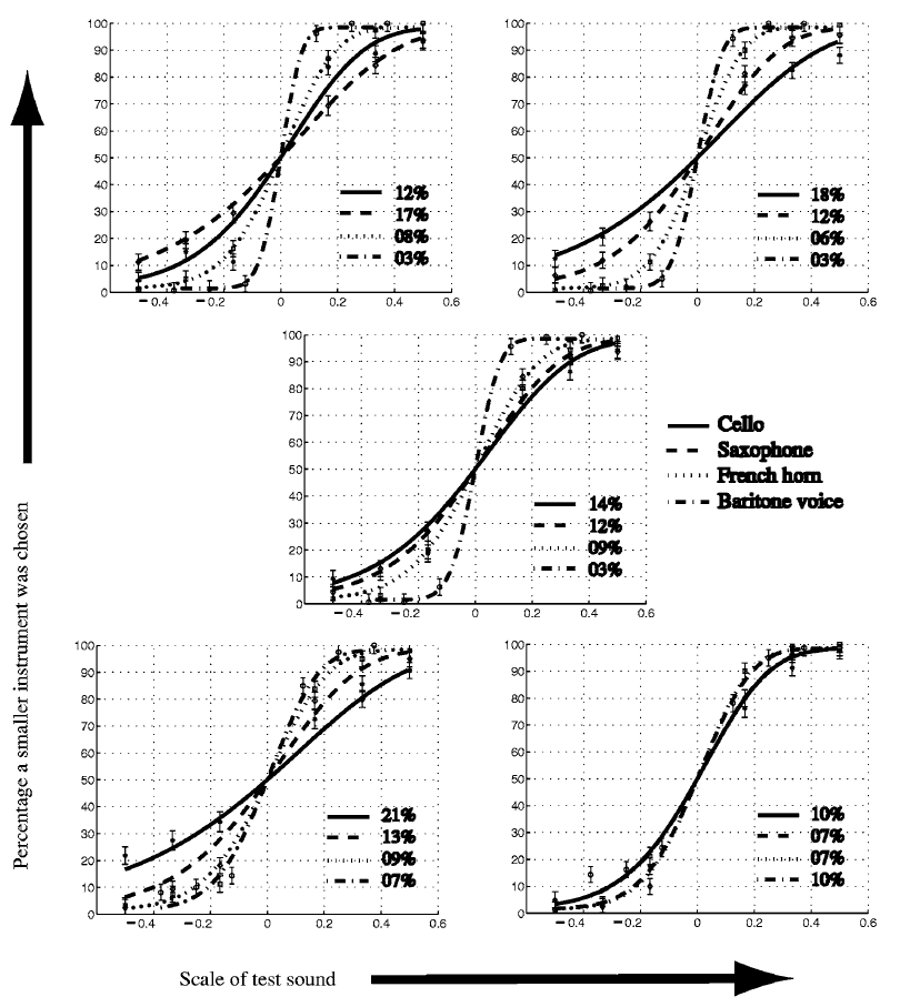 Figure 8. Psychometric functions showing average percent correct for the five conditions in Table 1. The positions of the five panels correspond to the positions in PR-RS space shown in Figure 4. The abscissa is a base-2 logarithmic scale. The solid, dashed, dotted and dashed-dotted lines are the psychometric functions for the cello, saxophone, French horn and baritone voice, respectively. The JNDs are indicated separately in each of the panels.