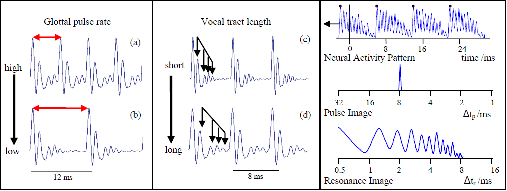 Fig. 1&2: Fig. 1: The internal structure of pulse-resonance sounds illustrating the pulse rate and the resonance scale. Fig. 2:Simulations of the NAP,pulse image and resonance image