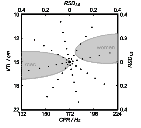Fig. 3: The locations of the scaled speakers in the GPR-VTL plane: The GPR of the scaled speaker varied between 137 and 215 Hz; the VTL varied between 11 and 21 cm. The reference speaker had a GPR of 172 Hz and a VTL of 15 cm. The grey ellipses correspond to speakers in the normal population as modelled by Turner and Patterson (2004).