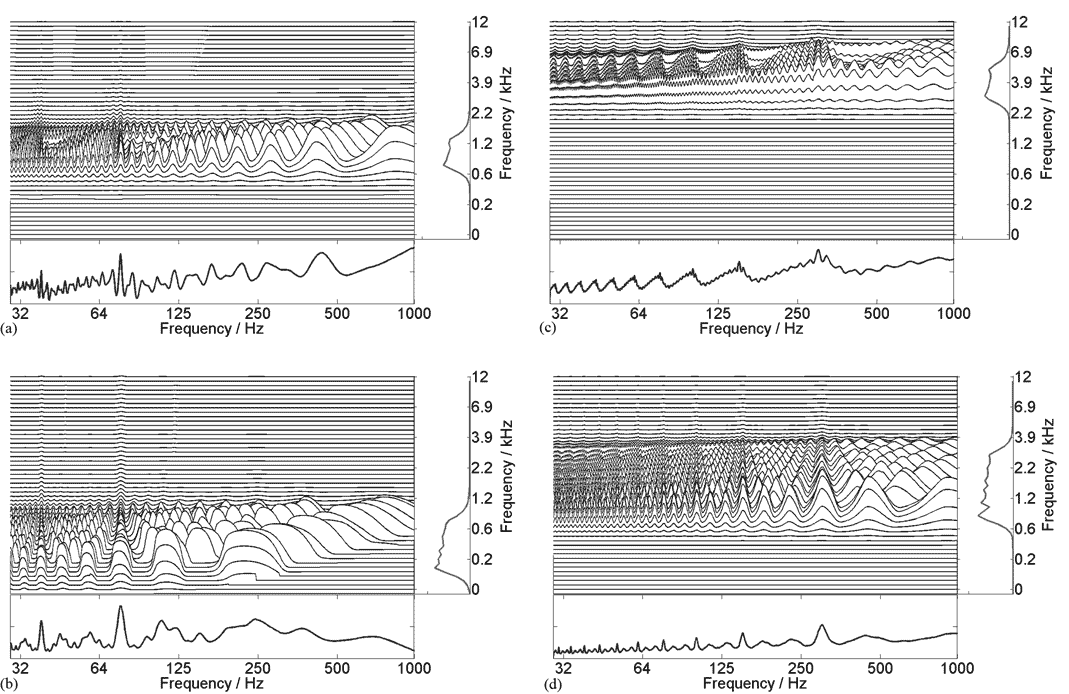 Stabilized Auditory Images (SAI) of four harmonic complexes. All stimuli have eight consecutive harmonics; they differ in their fundamentals and lowest components. (a) F0 = 75 Hz, harmonics 11 to 18; (b) F0 = 75 Hz, harmonics 3 to 10; (c) F0 = 300 Hz, harmonics 11 to 18; (d) F0 = 300 Hz, harmonics 3 to 10. Side panels show the spectral profiles (vertical) and temporal profiles (horizontal) of the auditory images.