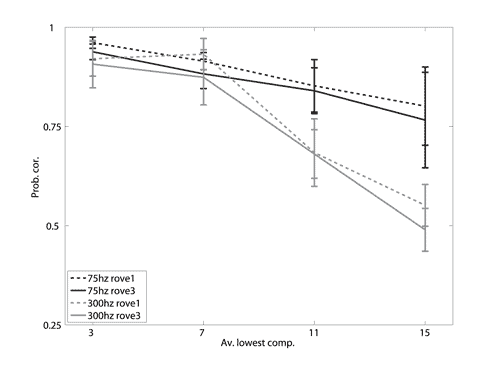 Performance on the melody task in the ancillary experiments with the 75-Hz fundamental (black lines) and the 300-Hz fundamental (grey lines). The abscissa shows the average lowest component and the ordinate shows the probability of the listener correctly identifying the note which changed. Performance is plotted separately for the two rove conditions. The dashed and solid lines show the results for LCR values of one and three respectively.