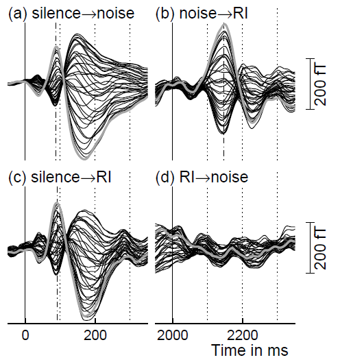 Fig.3: Neuromagnetic fields evoked by the onset of a noise (a) and a RI sound (c) at 0 ms, and by the transition from a noise to a RI sound (b) and from a RI sound to a noise (d) at 2000 ms. The RI sound had a delay of 8 ms and 16 iterations of the delay-and-add process, so it produced a strong pitch at 125 Hz which is just below the note ‘C’ one octave below ‘middle C’ on the piano keyboard. The data are from one representative listener. Each panel shows a compilation of the 37 measurement channels, averaged over 100 presentations of the respective stimulus. The data were lowpass filtered at 20 Hz, and baseline corrected to the 100-ms period of silence just before the onset of the standard at 0 ms. The POR had the same polarity as the N100m as illustrated by the gray line in panels (a) and (b) which highlights one specific channel.