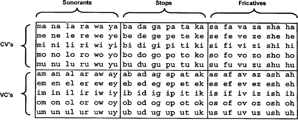 Table 1. Stimulus set showing categories of CV’s, VC’s and sonorant, stops and fricatives. Pronunciation details are described in the text.