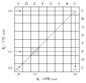The arrows in Figure 5 show the sequences of notes in each melody. This alternative notation for the melodies illustrates the interaction of the acoustic scale variables. Returning to Figure 4, for each melody, the black notes show the progression of intervals for Ss (or GPR) as each melody proceeds, and the grey notes show the progression of intervals for Sf (or VTL) as the melody proceeds. The sound files for the melodies are available at http://www.acousticscale.org/link/SHAR2009Demo. The shaded note [E, E] on the Ss-Sf plane provides the anchor for the notation; it has the same GPR and VTL values as the original syllables.