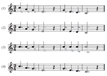 The discussion focuses on a set of four melodies designed to emphasize the role of the acoustic scale variables in the perception of vocal pitch and timbre. The novel aspect of the melodies is that, in some cases, the acoustic scale of the filter, Sf, varies over the course of the melody, either on its own, or in conjunction with changes in Ss. The scale of the filter is normally fixed when an instrument plays a melody. A form of musical notation for the melodies is presented in Figure 4; it shows that the melodies all have four bars containing a total of eight notes. The melodies are in ¾ time, with the fourth and eight notes extended to give the sequence a musical feel. The melodies have a ‘phonological text,’ that is, the notes are sung as syllables (pi, pe, ko, kuuu; ni, ne, mo, muuu), which emphasizes the human quality of the voice. As the timbre changes from vowel to vowel, it engages the phonological system and allows us to distinguish the role of envelope shape in melody perception, from the role of Ss and the role of Sf. The phonological text is the same for all four melodies.