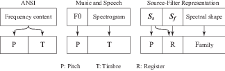 The ANSI definitions of pitch and timbre are not much help in understanding the perception of musical tones, in the sense of understanding what gives rise to the perception of melody, instrument family and register within a family. The ANSI definitions simply associate both pitch and timbre with unspecified aspects of the frequency content of a sound. In music and speech research, it is traditional to segregate one aspect of the frequency information, namely, F0 (the repetition rate of the sound), from the remainder of the information which is represented by the spectrogram. F0 is then associated with the pitch of the instrument or the pitch of the voice, in the same way that we have associated the scale of the source, Ss, with pitch. Thus, in music and speech research there is, at least, the segregation of the main determinant of pitch from the distribution of frequency information across the acoustic frequency dimension. The difference between these approaches and the acoustic-scale approach presented in this chapter are illustrated in Figure 6. The lower row shows how the frequency information is (or is not) divided up in each case, and the upper row shows the components of auditory perception; the arrows indicate the associations between the components of the frequency information and the components of perception. In the first column, which corresponds to the ANSI definition, there is only one arrow associating all of the frequency content, indiscriminantly, with both pitch and timbre. The second column, corresponding to music and speech research, shows how F0 is segregated from the spectrogram and associated with pitch.