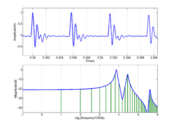 For humans, the most familiar communication sound is speech and the voiced parts of speech are classic pulse-resonance sounds. The vocal folds in the larynx at the base of the throat produce pulses of acoustic energy by momentarily impeding the flow of air from the lungs, and each of these ‘glottal pulses’ then excites a complex of resonances in the vocal tract above the larynx. The principles of vowel production will be illustrated with a synthetic three formant vowel. The upper panel of Figure 1 shows a brief segment of the waveform of the vowel which sounds like the vowel in the word ‘paw’ as spoken by a child.