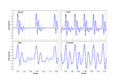 Comparison of the waveforms in panels (b) and (c) of Figure 3 shows that the GPR of the adult is lower (the period between pulses is longer); this is because the vocal cords are longer and more massive. The increase in the length and the mass of the vocal cords causes an increase in the acoustic scale of the excitation component of the wave, that is, an increase in the period of the glottal oscillation. The comparison also shows that the resonance rate of the adult is slower (the cycles of the resonance are longer); this is because the vocal tract of the adult is longer than that of the child. The increase in the length of the vocal cords causes an increase in the acoustic scale of the resonance component in the wave of the communication sound. These are the main effects of the increase in body size as observed in the waveform.
