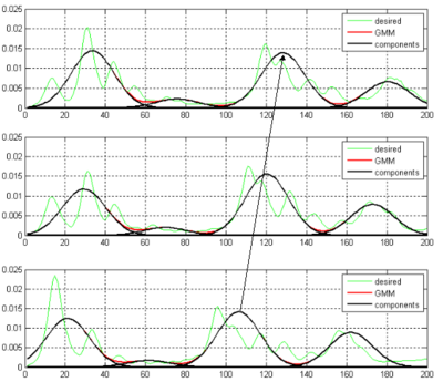 Gaussians fitted to the spectral distribution from an auditory filterbank in response to the vowel /i/ from different-sized speakers. The positions of the gaussians shift, but their amplitudes remain the same.