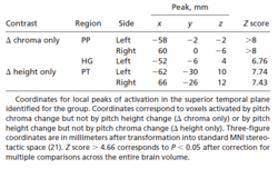Auditory scientists define pitch as the perceptual correlate of acoustic frequency: a single physical dimension along which musical notes can be ordered from low to high (1). However, humans perceive the notes of the scale as repeating once per octave: accordingly, music psychologists represent pitch as a helix (Figure 1a) with a circular dimension of pitch chroma and a vertical dimension of pitch height (2-5). The function of these two pitch dimensions is illustrated when the same melody is sung by a male or a female voice, or played by a violin or a cello. The vocal cords of women vibrate faster than those of men, and the strings of a violin vibrate faster than those of a cello. These physical differences correspond to differences in pitch height that contribute to our perception that women’s voices are higher than men’s and violins are higher than cellos. Note that this is distinction is not based on pitch chroma, since both voices or instruments can produce the full range of chromas; it is an average pitch height difference that is more properly associated with the perception that one source is higher than another. Whereas pitch chroma is used in tracking the information conveyed by a particular sound source, pitch height is used in the segregation of sources. This study describes a functional magnetic resonance imaging (fMRI) experiment designed to establish whether separate mechanisms for processing the two pitch dimensions exist in the human brain. Previous human fMRI experiments have shown that pitch information is processed in regions beyond primary auditory cortex (PAC). PAC is located in the medial portion of Heschl’s gyrus (HG) (6); musical melodies (7-9) and speech information (10,11) activate areas that are lateral and anterior to PAC. Other functional imaging experiments indicate that the human planum temporale (PT) (12) posterior to HG is involved in auditory object segregation (13). However, the chroma and height dimensions of pitch have not been separated in previous functional imaging studies. We therefore designed the present fMRI experiment to determine whether the helical model of pitch perception is reflected in the organization of the human brain. We tested the specific hypothesis that pitch chroma changes (auditory information streams) are processed in anterior auditory regions and pitch height changes (changes in sound source identity) are processed in posterior auditory regions.