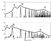 As the size of the body of a musical instrument increases, the frequencies of the resonances decrease in inverse proportion as illustrated in Figure 5. The top and bottom panels show the power spectra of notes produced by bowing a viola and a cello, respectively. The instruments are playing the same note (pitch). The hypothetical solid lines plotted above the harmonics in the panels represent resonance curves for the two instruments. The air resonance (A), main wood resonance (W), and bridge resonance (B) are indicated in the figure. For the viola the air, main wood and bridge resonances are about 230 Hz, 350 Hz and 2000 Hz, whereas the resonances of the cello are about 125 Hz, 175 Hz and 1500 Hz.