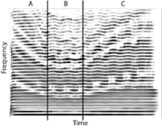 The figure shows (A) how the harmonics appear from one frequency and gradually are transformed to form a full spectrum of harmonics in part (B), at which point the voice sounds natural. In part (C) the harmonics are reduced again to a single frequency. One could, of course, have the instruments of an orchestral family zoom in from spectral points appropriate to the centroid of their average spectrum. The options would appear to endless, constrained only by the creativity of the scientist and the composer.