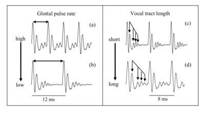 Speakers can also vary the tension of the vocal cords and change the pitch of the voice voluntarily. They do this to make prosodic distinctions in speech; for example, in many European languages, speakers raise the pitch of the voice at the end of an utterance to indicate that it is a question. This is also how singers change their pitch to produce a melody. The voluntary variation of tension makes the use of pulse rate as a size cue somewhat complicated. But basically, for a given speaker, the long-term average value of their voice pitch over a sequence of utterances, is size information rather than speech information. Whereas, the short-term changes in pitch over the course of an utterance are speech information (prosody) rather than size information.