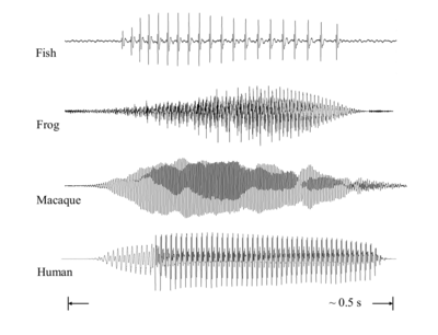 Finally, it should be noted that in the world today, most animals produce their communication sounds in the form of what might be called pulse-resonance ‘syllables’, that is, streams of regularly timed pulses, each of which carries a copy of the resonance to the listener. The syllables are on the order of 200-800 ms in duration, with a pulse rate in the region 10 to 500 Hz. The pulse rate rises a little at the onset of the sound, remains fairly steady during the central portion of the sound, and drops off with amplitude during the offset of the sound, which is typically longer and more gradual than the onset. A selection of four of these animal syllables is presented in Figure 2; they are the calls of (a) a Mongolar drummer, or Jamaica weakfish (Cynoscion, jamaicensis), (b) a North American Bull frog (Lithobates, catesbeiana), (c) a macaque (Macaca, mulatta), and (d) a human adult saying /ma/1.