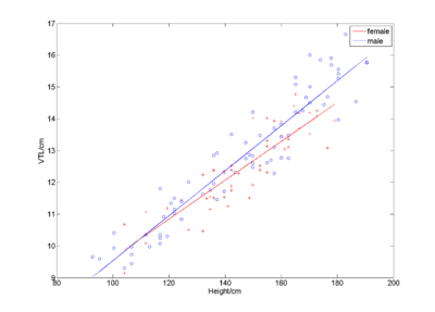 There is one developmental, albeit not longitudinal, study of vocal tract length by (Fitch and Giedd, 1999); they used magnetic resonance imaging (MRI) to record the anatomy of the vocal tract. The study included 129 subjects (76 males and 53 females) varying in age from 2.8 to 25 years. Great care was taken to define a reliable means of estimating vocal tract length, and subjects who were overweight or whose families had a history of language or developmental disorders were excluded. Figure 4 shows the resulting VTL values plotted as a function of height, separately, for the males (o) and females (+). Within each group, there is a reasonable distribution of subjects across the height range; there are proportionately more men at the tallest heights because, on average, males eventually grow taller than females. The lines show the best fitting linear growth functions for the two sub-populations; the rate of growth is 0.0708 and 0.0611 for the males and females, respectively. The correlation coefficients are 0.8950 and 0.7755, respectively, for the males and females. The correlation coefficients make it clear that there is no doubt that VTL increases with height for both males and females. At the same time, the variability of the data precludes more detailed analysis concerning questions such as whether the rate of growth of VTL is significantly greater for males, and whether the rate changes at puberty. (Turner et al., 2009) used an estimation-maximization technique to determine whether a polynomial with a quadratic term would provide a substantially better fit to the data, taking into consideration the fact that it includes an extra free parameter; the analysis indicated given the variability of the data, a linear fit was a better choice. (Fitch and Giedd, 1999) included a somewhat controversial questionnaire in their study designed to ascertain whether their males had passed the age of puberty, and based on the results they concluded that the rate of growth of the vocal tract does increase at puberty in males. However, in the absence of data on the sexual maturity of individuals, the population statistics do not distinguish males and females with regard to vocal tract length, except insofar as males eventually grow taller than females, on average, and hence, on average, adult males have longer vocal tracts than adult females.