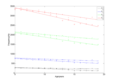 Graphical representations that show the full range of formant frequencies, like Figure 6, or the full range of formant wavelengths, like Figure 7, have the advantage or revealing whether there is a relationship between local frequency effects, like the reduction of one particular formant frequency with increasing age, and global frequency effects, like the increase in the gradient of the frequency versus age function as formant number increases. This is important for the current discussion inasmuch as it shows that the two effects are related and might be determined by the same underlying, or latent, variable which in this case is VTL, or the more general growth variable that causes the humans to grow with age. However, these full range graphical representations have the disadvantage that they compress local effects. So the adolescent pitch change in males is obscured by compression in Figure 6, and the divergence of the male third formant values from those of the females is obscured at the bottom of Figure 7.