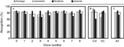 In the main experiment, the pattern of results was essentially the same for the two performance measures: percent correct and RAU. For the sake of brevity, we plot only the percent correct scores while the statistics reported below are for the RAU scores; the RAU statistics are arguably more prudent than the percent correct statistics. There were significant main effects for all three factors: voice (F[8,288]=9.89, p<0.001, ε=0.81, ηp2=0.22), consonant-vowel order (F[1,36]=10.77, p=0.002, ηp2=0.23), and consonant category (F[2,72]=88.36, p<0.001, ε=0.98, ηp2=0.71). Moreover, there were significant interactions of consonant category with voice (F[16,576]=3.18, p=0.001, ε=0.62, ηp2=0.81) and consonant-vowel order (F[2,72]=233.13, p<0.001, ε=0.86, ηp2=0.87). The directions of these effects are shown in Figure 3. For the experimental voices, the best performance (83%) was produced with voice 8, and the worst (73 %) with voice 3.
