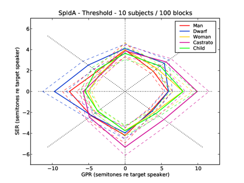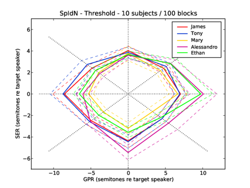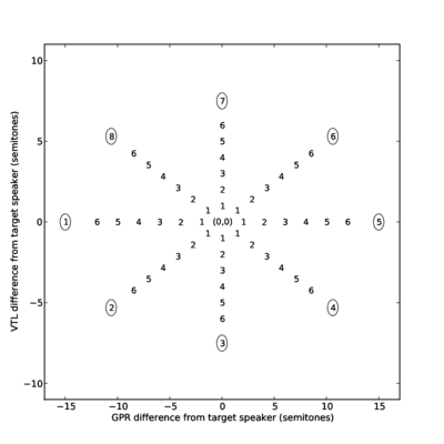 In both experiments the whole experiment was divided in 10 blocks. In each block, the 245 conditions were tested. The blocks were grouped by sessions of no more than 2 hours. Both experiment included a training procedure. In the Anonymous experiment the training consisted in a short block with 3 random conditions to allow the subjects to familiarize with the GUI and procedure. In the Named experiment the training was more thorough and repeated at the beginning of each session. In the training block, each target speaker was presented twice: first compared to itself (0,0), then compared to the furthest point on the second spoke (2,6).