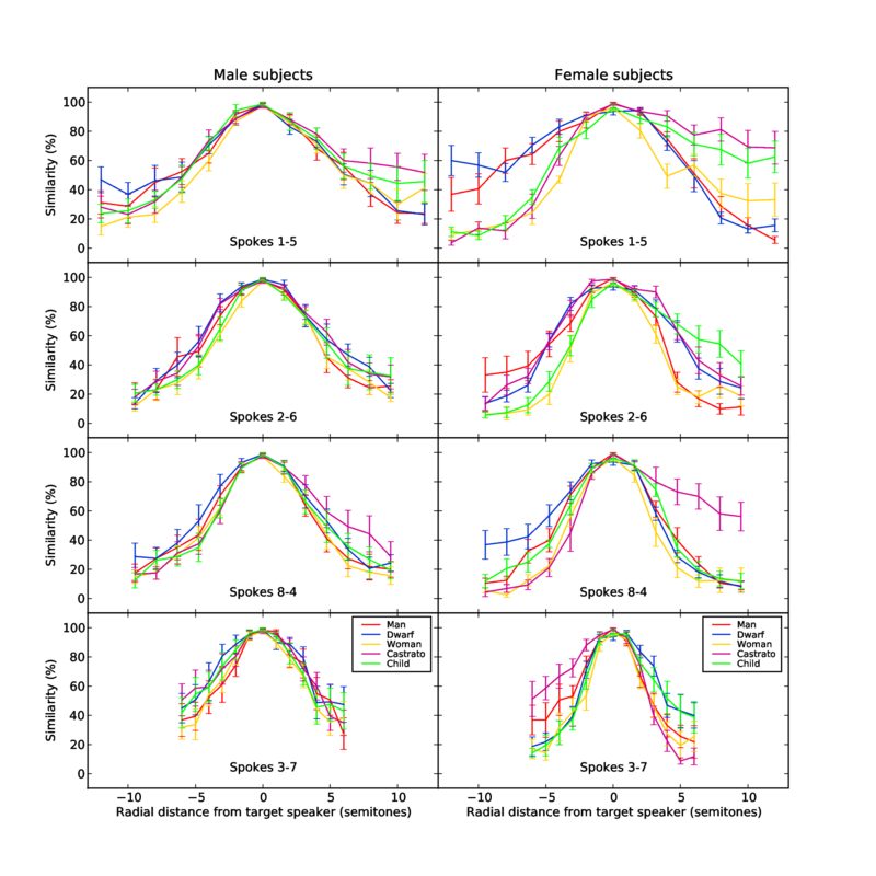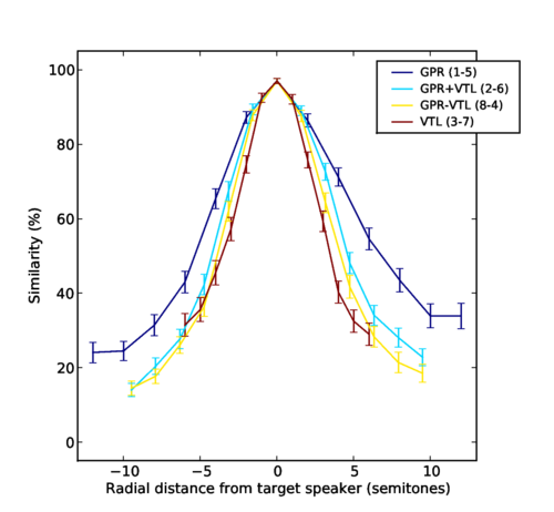 4. Similarity judgement as a function of VTL difference. Each curve represents a set of spokes. For the two diagonal spokes, the VTL distance is the projection of the radial distance on the VTL axis, i.e. the VTL component of the radial distance.